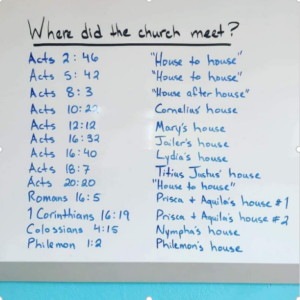 - House Church: This would be the most familiar way to start a church from scratch. You start with a Bible study in a home and grow from there. Maybe you never outgrow meeting in a house on purpose. This certainly has NT precedent (see image).