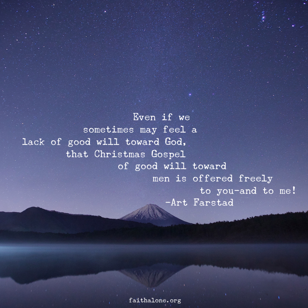 Dear reader, even if we sometimes may feel a lack of good will toward God, that Christmas Gospel of good will toward men is offered freely to you—and to me!