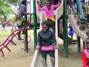 One of the really fun things at Camp this year is that the kids got to play on a playground for the first time in their entire lives. The only playgrounds in Lusaka are for the rich, and they require an expensive paid membership fee to use. They got to swing and slide for the first time. At first they were very nervous— they had no idea what it was going to feel like, but as they got brave and tried it, they absolutely loved it. They could not scramble back to the top of the slide fast enough. What fun!